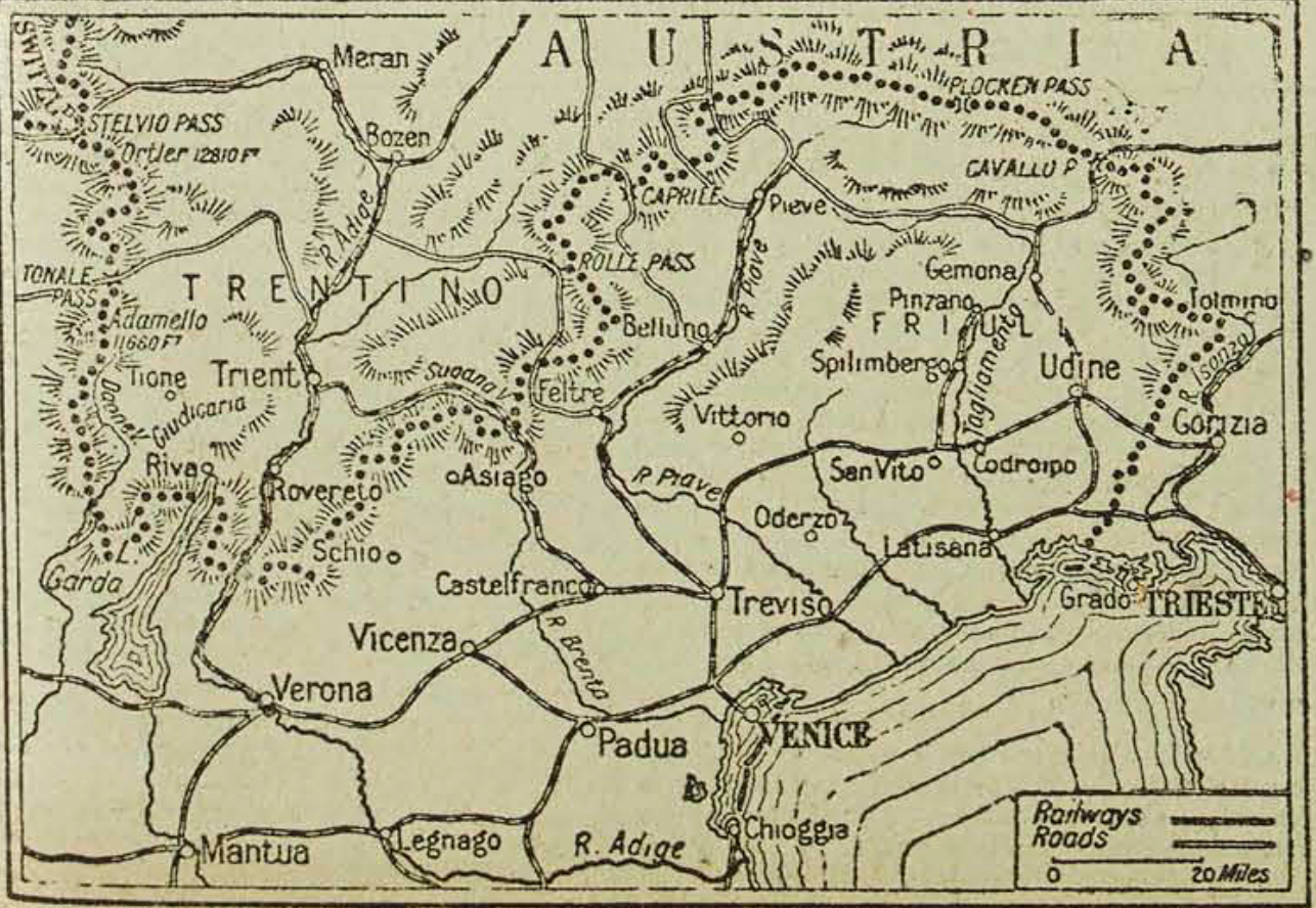“Between the rails it was open to the flooded Tagliamento forty feet below, since the bridge was an open one with the rails only being carried across on the sleepers, which merely rested on the open framework of the bridge. We moved on, foot by foot, to the entrance of the bridge, the crush becoming terrific…