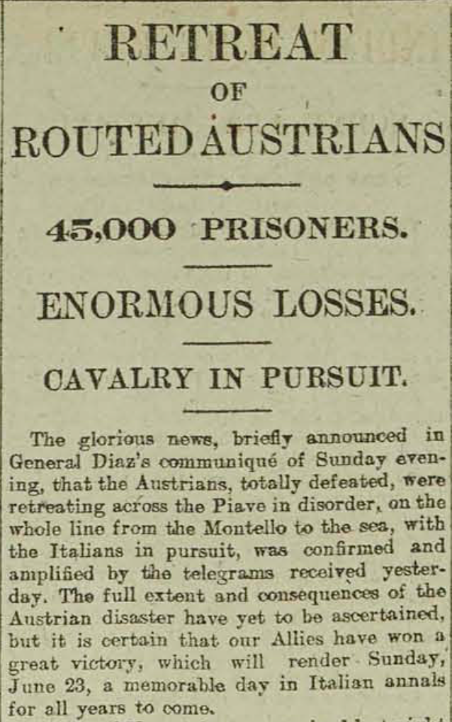 The Italian Campaign has dominated our newspapers’ coverage of the War these past ten days, and today’s announcement that the Austrian attack on our Italian allies has ended in total defeat is most satisfactory.