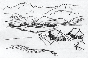 If you look on the map you will see that on the borders of Persia and Mespot there are endless successions of mountain ranges. My sketch shows the craggy peaks of the first series as seen from the camp in which we are quartered till tomorrow, when we continue by car to Kirmanshah, Hamadan and Kazvin